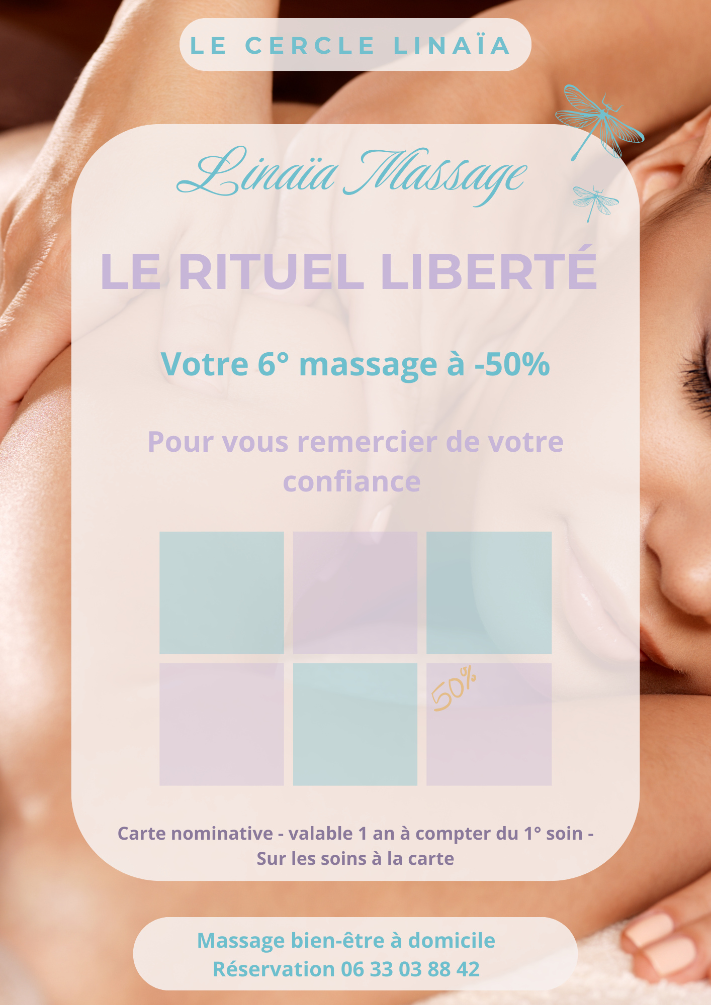 Vous revenez, et c’est la plus belle des choses. Pour vous remercier de faire de ces moments un rendez-vous avec vous-même, votre 6ème massage vous est offert à -50%.