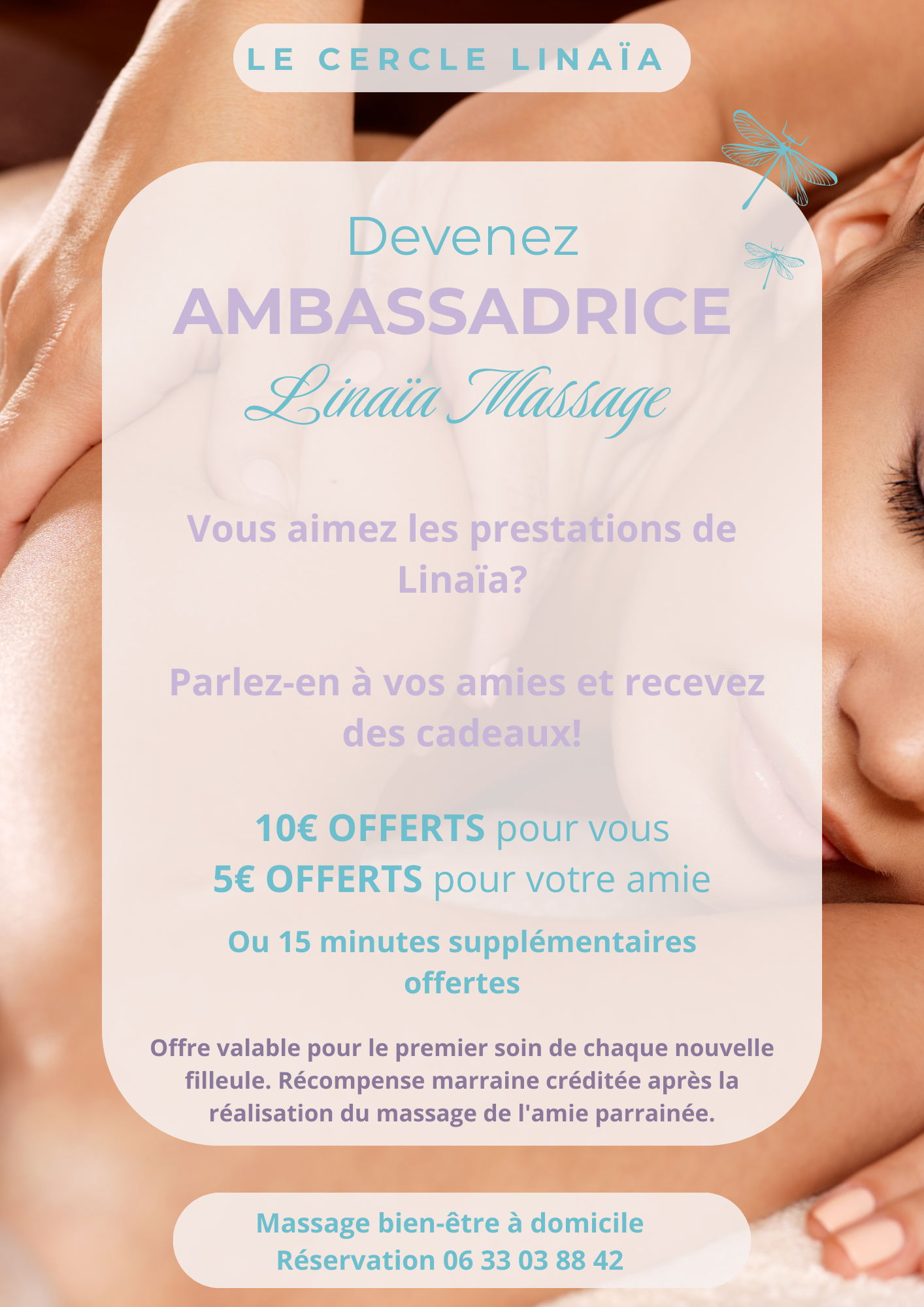 Pour chaque nouvelle filleule, vous bénéficiez de 10€ de réduction ou 15 minutes offertes sur votre prochain massage.